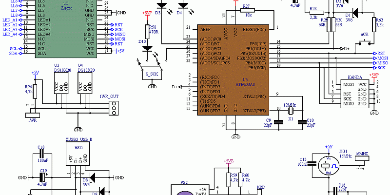 U3 и U4 (DS18B20) – это датчики температуры работающие по шине 1-wire. Для правильной работы шины необходим резистор R24 (4,7 кОм). 1WR_OUT разъем позволяет подключать дополнительные датчики, а разъем 1WR обеспечивает связь с модулем микроконтроллера. PS2 разъем (Mini DIN6) есть не что иное, как разъем для подключения клавиатуры персонального компьютера. Резисторы R59 (4,7 кОм) и R60 (4,7 кОм) подтягивают шину данных и вывод “Clock” к плюсу. Разъем KBD обеспечивает связь с модулем микроконтроллера. Клавиатура питается от внешнего источника питания +5 В.