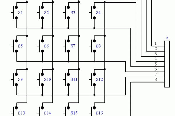 Кнопки S1 – S16 образуют соединение строк и столбцов (так называемый #). Чтение состояния кнопок производится следующим образом: в столбцах по очереди выставляется лог “1”, в это же время читаются уровни в строках. Если при установке лог. “1” на вывод 8 на выводе 2 присутствует лог. “1” , то нажата клавиша S14. Разъем используется для подключения клавиатуры к отладочной плате.