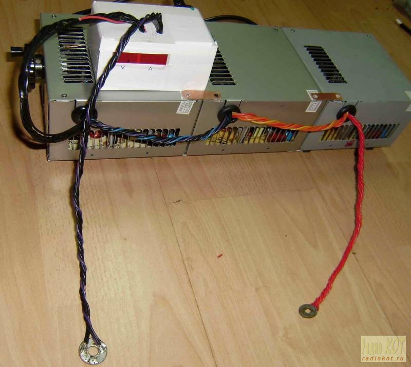 Теперь включаем «трио – блок» в сеть 220в через лампу 100W. Проверяем напряжение на выходе каждого блока, что бы оно было примерно одинаковым. Например, выставили 6 вольт, то и на каждом должно быть примерно по 6 вольт. Выключаем. Теперь соединяем выхода каждого блока согласно схеме – последовательно. Для соединения берем выходные провода, которые отпаяли от блоков перед переделкой. Для этого надо скрутить по 10 – 15 проводов вместе на один провод. Я скручивал только по семь в один и они ощутимо греются, поэтому лучше брать больше. Включаем. Меряем напряжение на выходе трех последовательно соединенных блоках питания. Оно должно быть в три раза больше чем на одном. Выключаем. Резистором R2 выставить минимальный ток, переведя его в положение макс. сопротивления. Подключить амперметр на выход напрямую. Включаем. Ток должен быть 6А. Далее увеличиваем ток до 12А, медленно вращая переменный резистор. Выключаем. Проверяем радиаторы на предмет перегрева, и если все нормально, то продолжаем дальше. Подключаем вентиляторы, для обдува каждого блока питания. Включаем в сеть через три – четыре лампочки 100W параллельно (ну на всякий случай) и продолжаем проверку. Далее увеличиваем ток до 30А, медленно вращая переменный резистор. Выключаем. Проверяем радиаторы на предмет перегрева, и если все нормально, то продолжаем дальше. Включаем в сеть напрямую и продолжаем проверку. Далее очень – очень плавно увеличиваем ток до 50А, медленно вращая переменный резистор. Выключаем. Проверяем радиаторы на предмет перегрева, и если все нормально, то продолжаем дальше. Подключаем нагрузку 0,2 ома. (много нихромовых коротких проволок параллельно с обдувом вентиляторами). Включаем в сеть напрямую и продолжаем проверку. Плавно увеличиваем ток с 6А до 30А, медленно вращая переменный резистор (вентиляторы при этом обдувают блоки). Держим 1 минуту. Выключаем. Проверяем радиаторы на предмет перегрева, и если все нормально, то продолжаем дальше. Плавно увеличиваем ток с 30А до 50А, медленно вращая переменный резистор (вентиляторы при этом обдувают блоки – это обязательно!). Держим 1 минуту. Выключаем. Проверяем радиаторы на предмет перегрева, и если все нормально (примерно градусов 40 – 50), то настройка завершена.