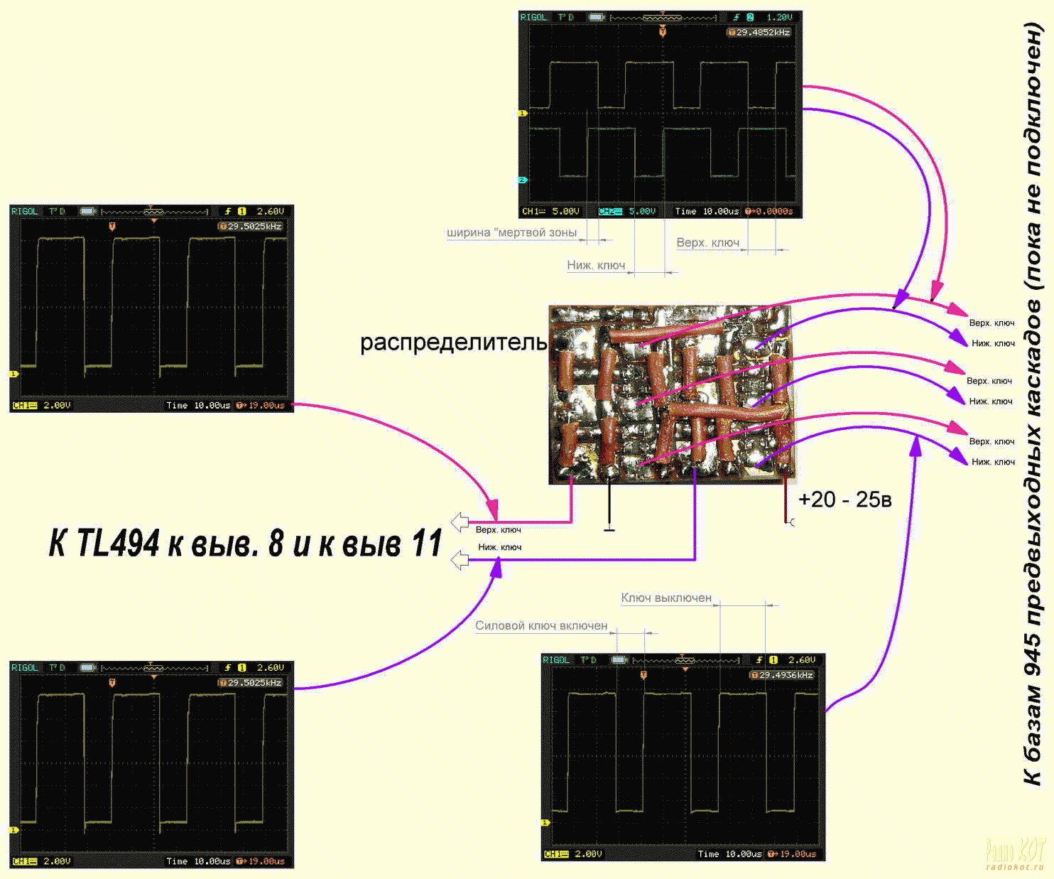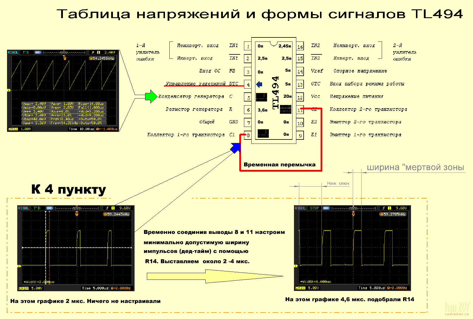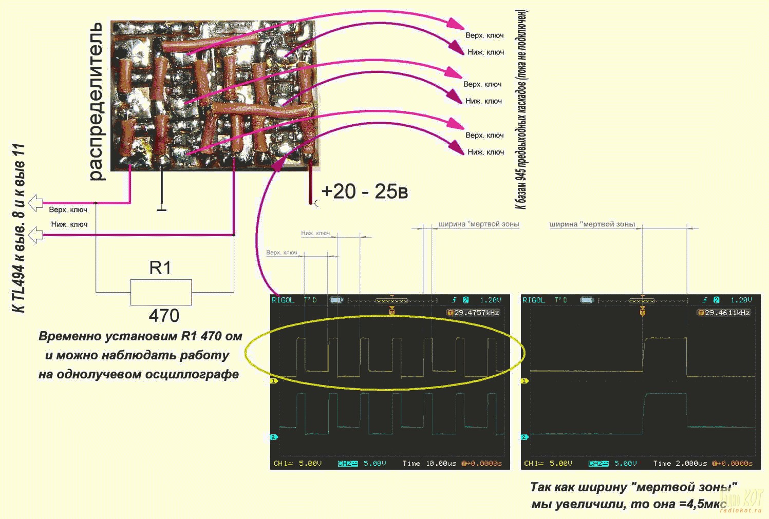 Для лучшей наглядности и понимания что же происходит на выходе и как управляется силовой выходной каскад, лучше проводить наблюдения двух лучевым осциллографом. Но можно и с одним лучом. Для наблюдения можно временно добавить резистор на 470 ом между 8 и 11 выводом 494. Тогда мы увидим такую картину (смотрим рисунок, там пояснения), за одно можно еще раз проверить мертвое время.
