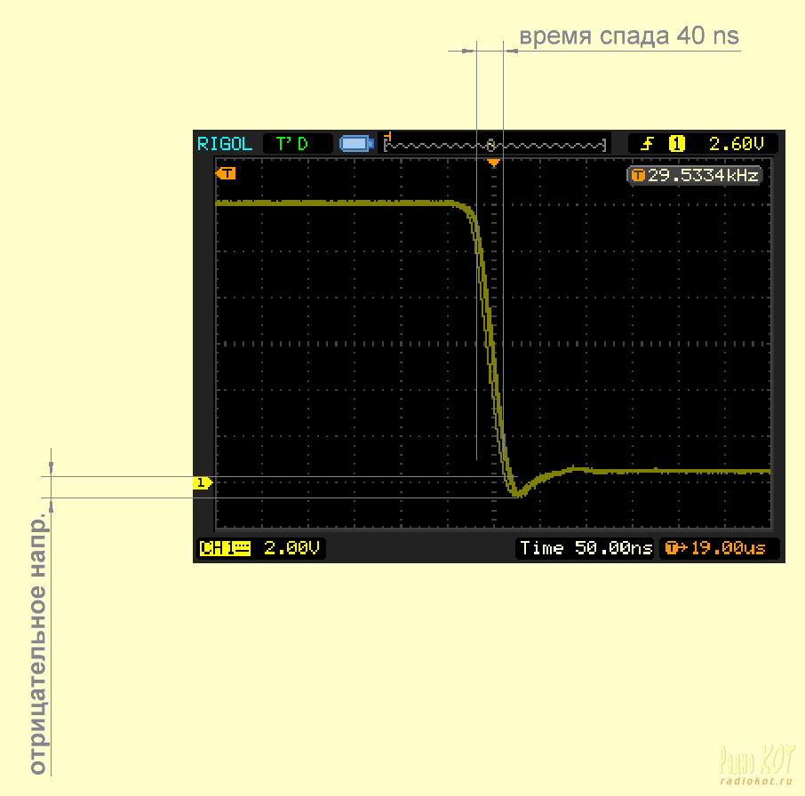 Теперь проверим работу форсирующей цепи, которая ускоряет переключение транзисторов. Для этого станем осциллографом в точку соединения двух баз КТ315 и КТ361, и наблюдаем на спаде импульса не большое отрицательное напряжение. Если оно есть, то цепь исправна.