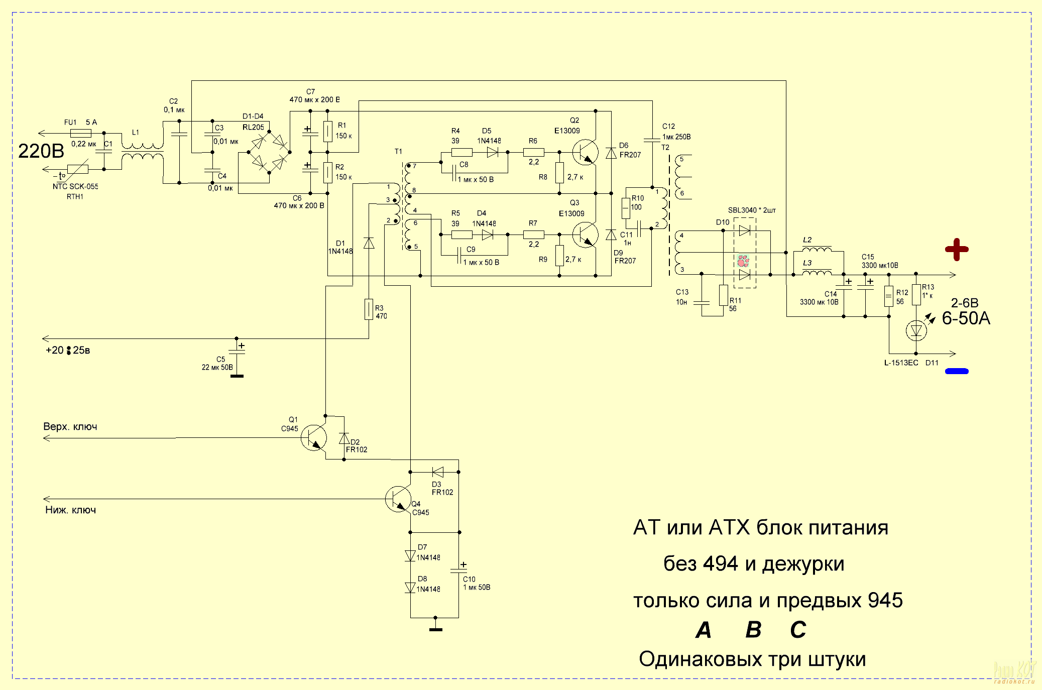 Для переделки брались три блока фирмы CODEGEN 300, как самые распространенные. Из трех одинаковых берем два блока. Эти два блока приводим в соответствие со схемой функционального блока силовой части. Выпаиваем 494, и все транзисторы мелкие, кроме предвыходных…. Вообще идем по схеме. Для дросселя используем обмотки канала 5 вольт, (они там в два провода намотаны). Диоды SBL3040 ставим два в параллель. Тот, который там стоял, так и оставляем, и ставим туда еще один. Желательно диоды брать одной фирмы. В блоках CODEGEN 300 они уже стояли в канале 3,3 вольта, и я их просто перекинул перемычками на 5 вольтовую обмотку силового трансформатора. Обмотка с канала 12 вольт силового трансформатора не используется.