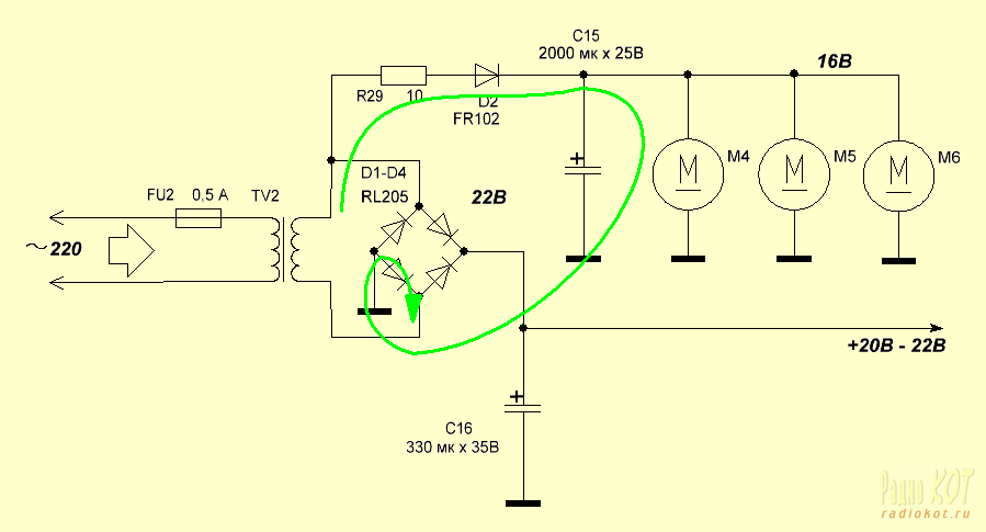 Блок шим и распределитель импульсов питается от двухполупериодного выпрямителя, а вентиляторы от однополупериодного, для снижения на них напряжения. Стрелкой показано течение тока для питания вентиляторов.