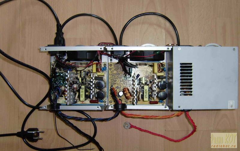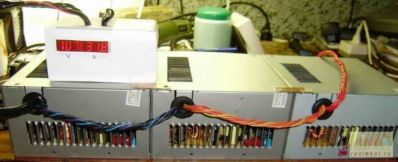 Я поведаю Вам о том, как же преодолеть барьер высоких мощностей (достаточных для радиоКота), совершенно простыми и подручными средствами. Каждый наверняка сталкивался с необходимостью в мощном регулируемом источнике питания. Кому то приносили мощные автомобильные усилители с током потребления в 50 ампер по питанию 12в, разные UPSы, да и прочую технику. Ну, а может кто-то из Вас хотел заняться гальваникой? А может Вы просто хотели зимой завести авто от розетки? Во всех этих случаях Вам, конечно же не хватало мощного источника питания. А ведь такой мощный блок просто так на коленке быстро не собрать, и на это нужно много времени и сил. Так давайте же вместе развеем этот миф, и соберем такой мощный блок, на все случаи жизни, всего за…… два вечера, придя после работы домой! «Не может быть!» невольно возразите Вы, а как же необходимые детали, трансформаторы, ферриты, мосты, и прочее, прочее….. А зачем нам это все? Нам достаточно заглянуть каждому в свою кладовку (или под рабочий стол) и там все необходимое у каждого радиоКота уже есть и, так сказать, давно там пылится!!! Заглянули? И что мы там видим? Ха! Совершенно верно – компьютерный блок питания! Да и не один! Ну и на кой они Вам? Так и будут дальше валяться? Конечно нет! Мы с вами соорудим мощный блок питания для всех случаев жизни радиоКота. Это и зарядка, и пусковое, и лабораторный блок питания, и источник для гальваники и т.д. и т.п. Каскадное соединение источников питания – просто необходимость. Давно уже просматривается тенденция в получении больших мощностей с помощью большого числа блоков, меньшей мощности и работающих совместно на одну нагрузку.