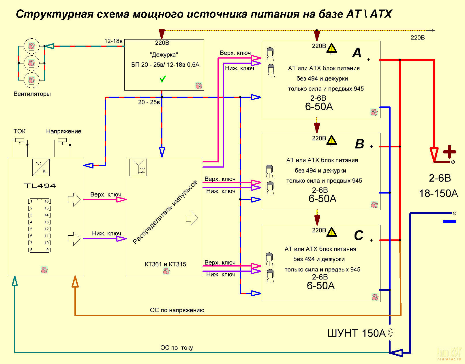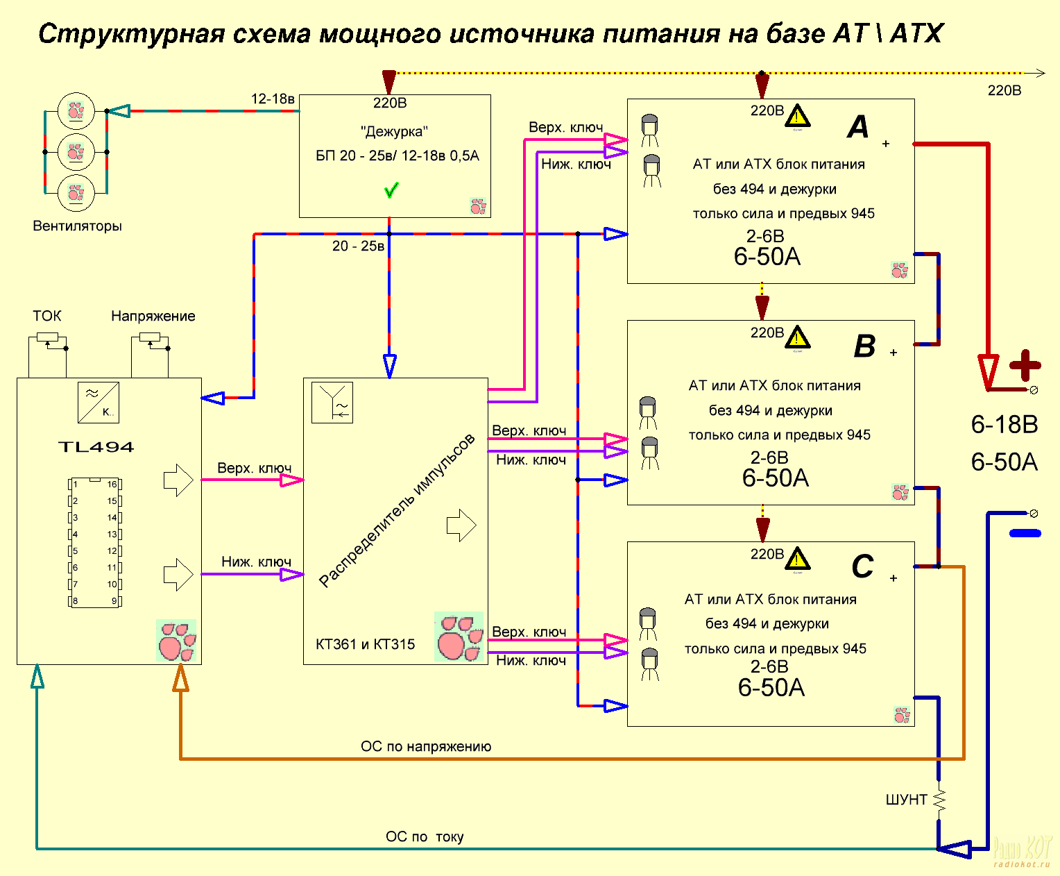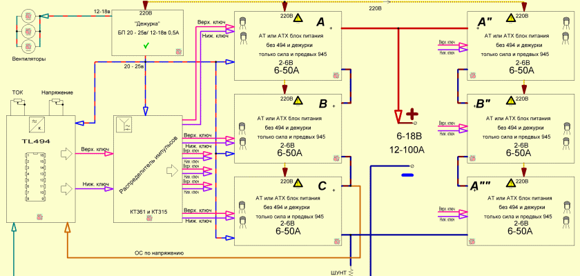 Все линии одной расцветки имеют одноименное назначение. Например, линия красно-синяя с дежурного блока питания 20-25в – означает, что это питание заводится во все функциональные блоки от данного блока питания. Три кирпичика А, В, С каждый дают напряжение от 2 до 6 вольт и ток от 6 до 50 ампер. Но, надо учитывать максимально допустимую мощность, если выставили 18 вольт, то даем максимальный ток только 40А, ну а если 12 вольт, то можно брать ток в нагрузку и все 50А.