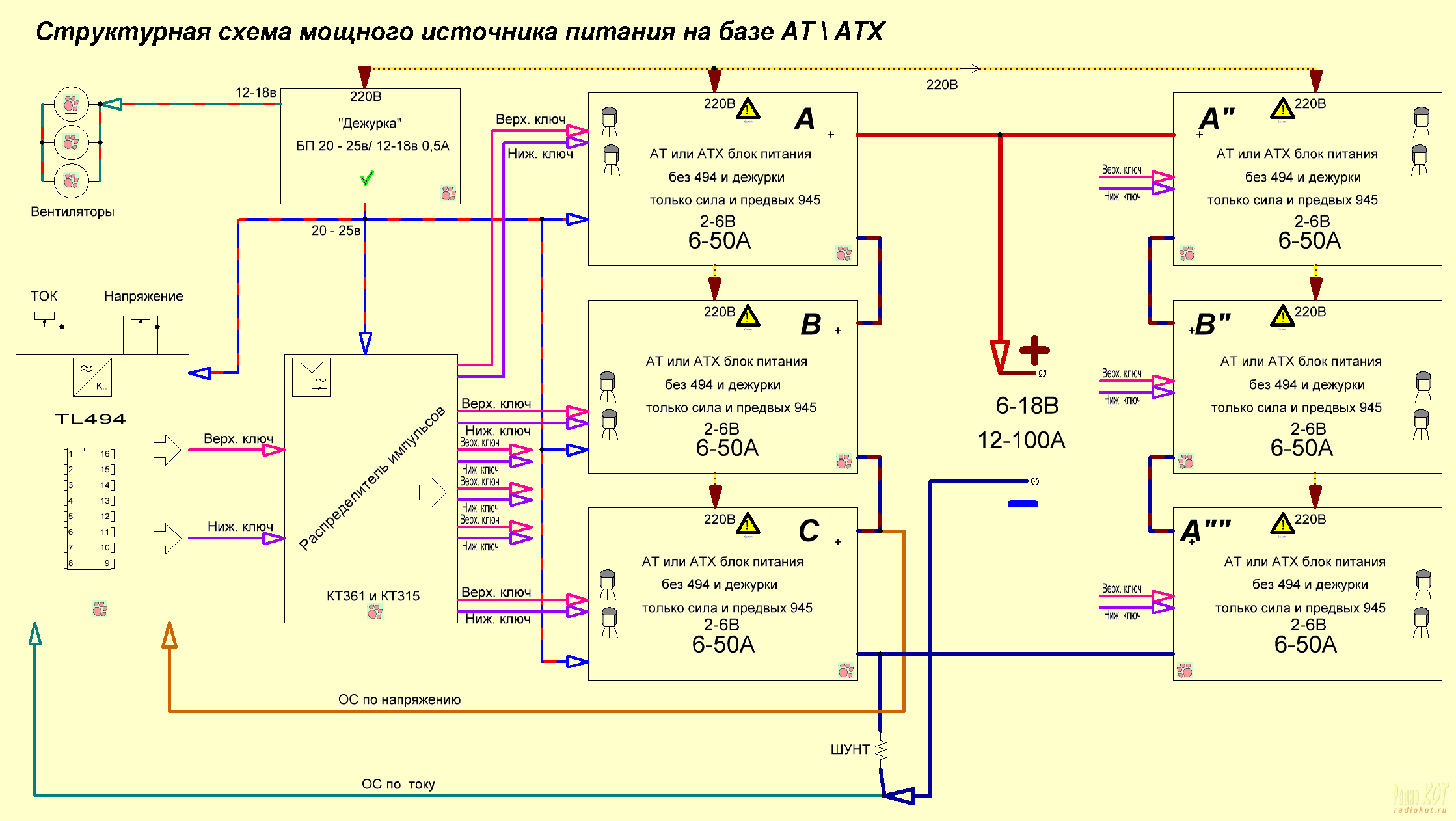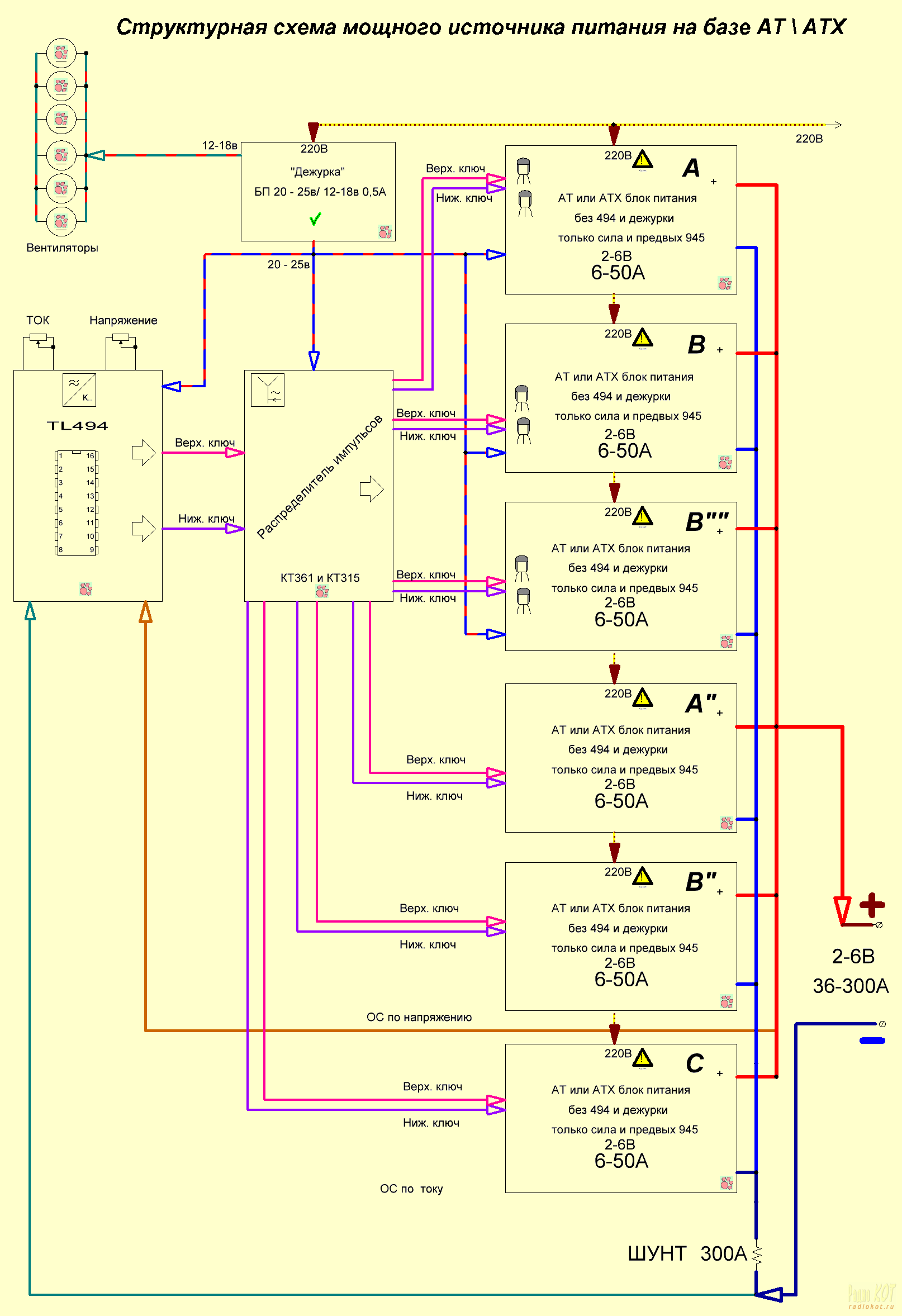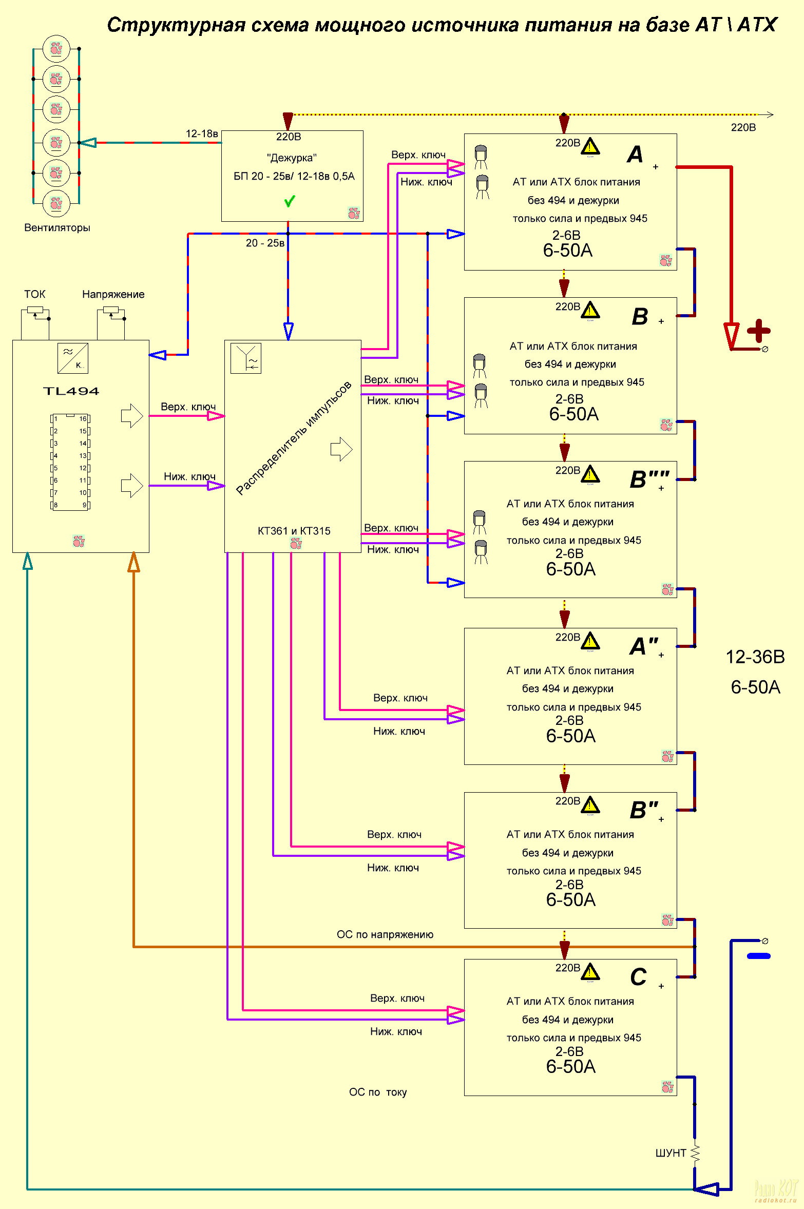 Все линии одной расцветки имеют одноименное назначение. Например, линия красно-синяя с дежурного блока питания 20-25в – означает, что это питание заводится во все функциональные блоки от данного блока питания. Три кирпичика А, В, С каждый дают напряжение от 2 до 6 вольт и ток от 6 до 50 ампер. Но, надо учитывать максимально допустимую мощность, если выставили 18 вольт, то даем максимальный ток только 40А, ну а если 12 вольт, то можно брать ток в нагрузку и все 50А.