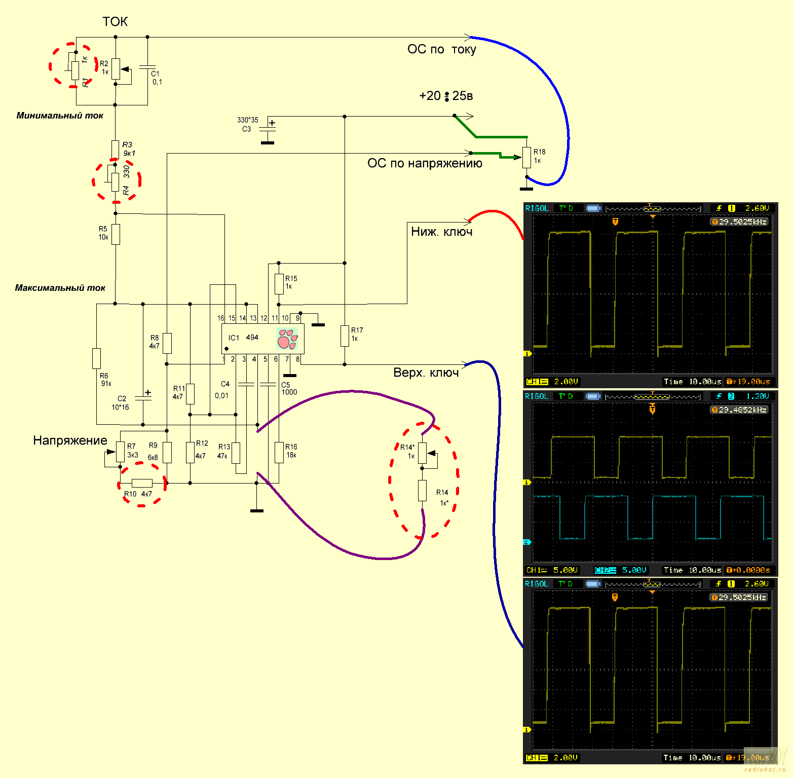 - Подогнать с помощью R7, R9 и R10 диапазон регулировки напряжения от 6 до 18 вольт. Для этого подключим временно сопротивление R18 1к и будем подавать напряжение от 6 в до 18 вгоняя в заданный диапазон. Ориентиром будет появление или пропадание импульсов с выхода 494 с выводов 8 или 11. После примерной калибровки так пока оставить.