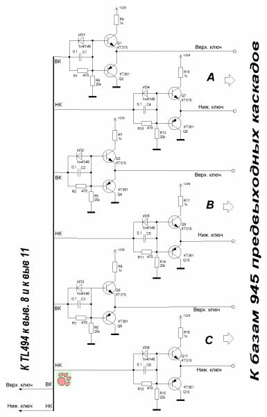 Схема распределителя импульсов представляет собой несколько изменённый простейший двухтактный эмиттерный повторитель. В каждый добавлена форсирующая цепь и ограничительный резистор в цепи коллектора обратного транзистора. Таких повторителей всего шесть, по два на каждый блок питания.